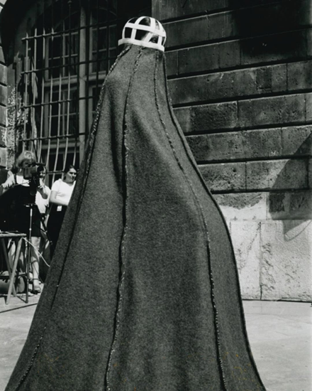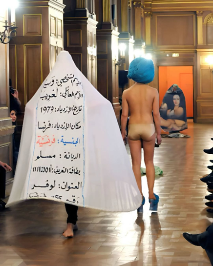 Sanatçının 1996’da Paris’te gerçekleştirdiği ilk performans defilesi, bedenin hareketini kısıtlayan ve Fransız bayrağının renklerini taşıyan “Cumhuriyetin Çarşafı” adlı kostümle son bulur. Bu güçlü karşıtlık laiklik, beden politikaları ve toplumsal kontrol üzerine çarpıcı bir soru ortaya koyar. Ancak sanatçının biçimsel stratejileri, Batılı izleyicinin uzun süredir tükettiği oryantalist imge repertuarını — çarşaf, peçe, ‘mahrem kadın bedeni’ — yeniden devreye sokar. Böylece işler, farkında olmadan Batı’nın talep ettiği egzotik ve risksiz temsil modeline yaklaşır.