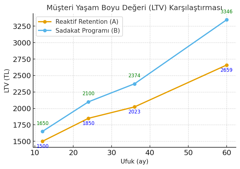 - Sadakat modeli (B): Churn oranı %1,1/ay, ARPU 205 TL, aylık 12 TL sadakat programı maliyeti.